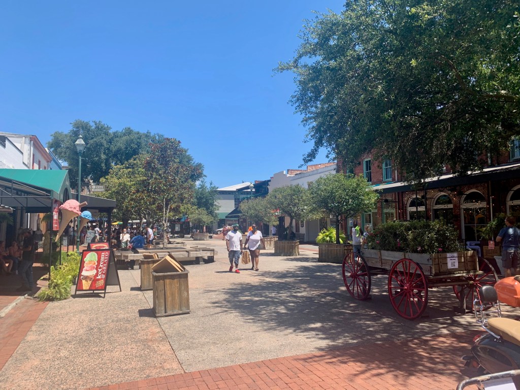 We arrived in Savannah around 2pm on a Saturday afternoon and immediately got on our walking shoes to head down to the City Market area, just a short 10 minute stroll from the hotel. Of course, the first stop in the 90+ degree heat was a visit to Wet Willie’s to get a frozen adult beverage–just what we needed to cool off in the heat. Upon entering the main area of City Market, we immediately noticed a few differences in how others were treating the presence of COVID. The mask wearers were somewhat few and far between (except for inside bars/restaurants where the city had just mandated mask-wearing), and it just seemed super lax and casual considering the current state of things. It was a little unnerving but we did the best we could. At Wet Willie’s (our only stop) they were doing a fantastic job of mask enforcement, social distancing, and even a temperature check upon entry. Nice work Willie!