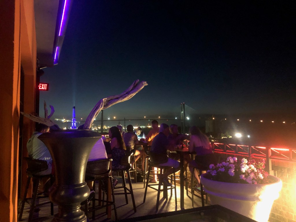 After a quick nap at the hotel, we ventured out again to find something to eat for dinner. Most of the places we initially checked out were either closing early or did not have any availability. We were told a similar story at our 3rd stop at Ruth Chris Steakhouse, but Olivia somehow managed to snag a last minute reservation online. Score! We had 30 minutes to kill–just enough time to grab drinks (across the street) at one of my favorite spots in Savannah: Rocks on the Roof.