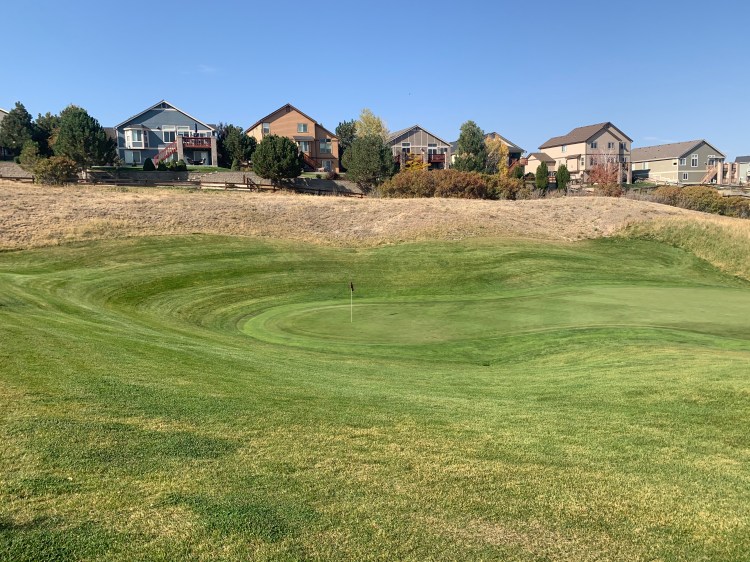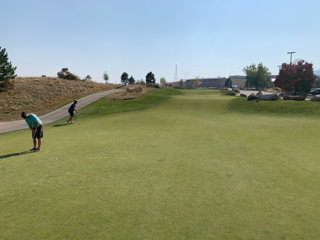 After a short nonstop flight from RDU to Denver, we grabbed some lunch and made our way over to the course. The clubhouse was situated on a nice tall hill (mountain essentially) that basically cut the front and back nines in two. The practice green here at Fossil Trace was the craziest I have ever seen, with a triple-tiered putting surface that had an elevation change of nearly ten feet at each individual level. Never seen anything like it before.