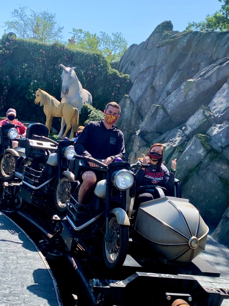 After departing Hogwarts castle, we were just about ready to get in line for our turn on Hagrid’s Motorbike Adventure. The anticipation grew as we entered the queue and the group got their first look at this mesmerizing attraction. The amount of track and kinetic energy involved with this coaster is palpable, and I was hyped to get the family on for their first ride. Unfortunately, a couple lengthy delays killed a bit of that gusto, but we were able to finally board after just over an hour of waiting. So all things considered, not too bad. And my brother and his girlfriend loved the ride so much they had to book a return trip for the following day to ride again!