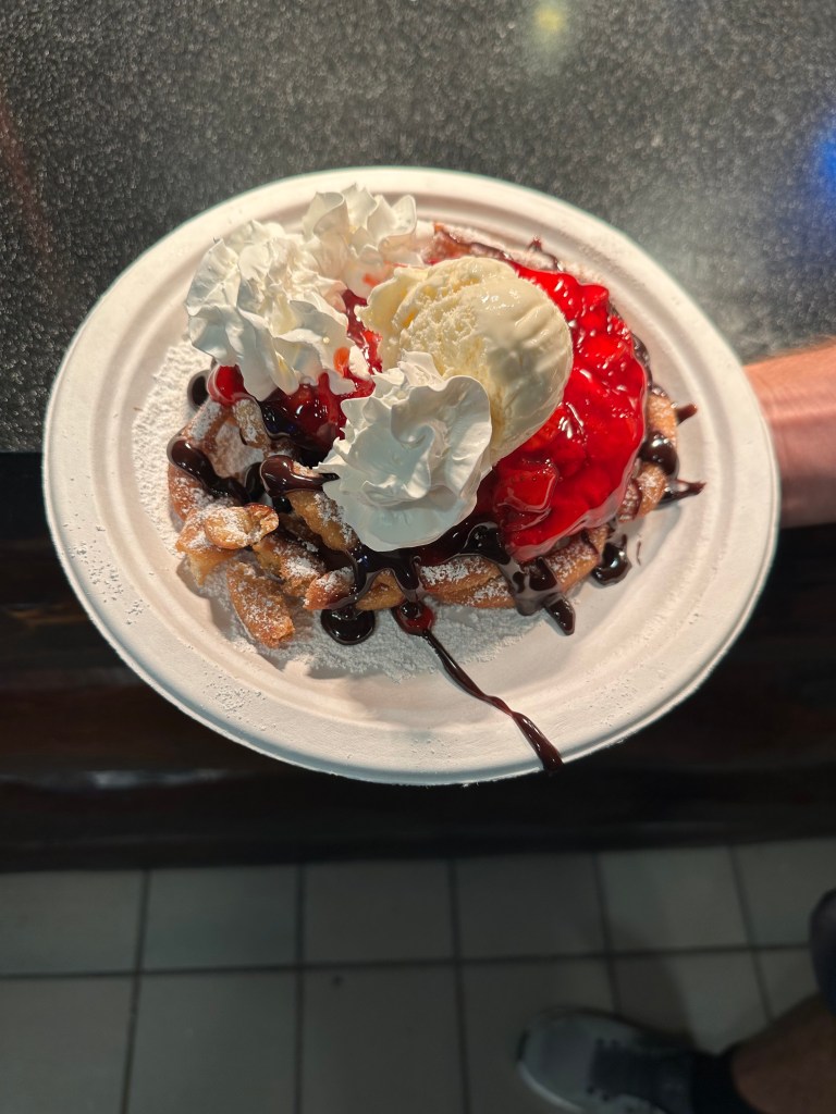 After some shaved ice and Auntie Anne’s pretzel bites, we were on our way to Williamsburg for Saturday night + Sunday morning at BGW. Just as we expected, we arrived to a relatively busy park but we’re able to get on Finnegan’s Flyer with just a two cycle wait. From there, we went on a tear enjoying some of the food and drink offerings. Our trip aligned with the park’s annual Food and Wine festival, so we started with some tacos and margs from the Mexico booth that were delicious. From there, we indulged in some bacon & cheddar fries from the legendary Les Frites, and we capped it all off with a strawberry shortcake funnel cake. Of course we split all these items, but we were more than stuffed after this endeavor. What better way to settle your stomach than with roller coasters! We closed out the night with rides on Griffon & Apollo’s Chariot, with plans to return early the next morning for a special treat…